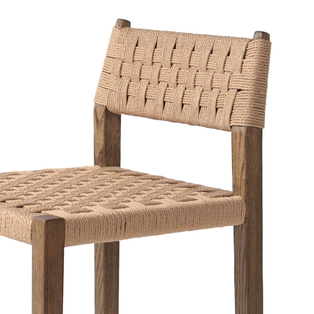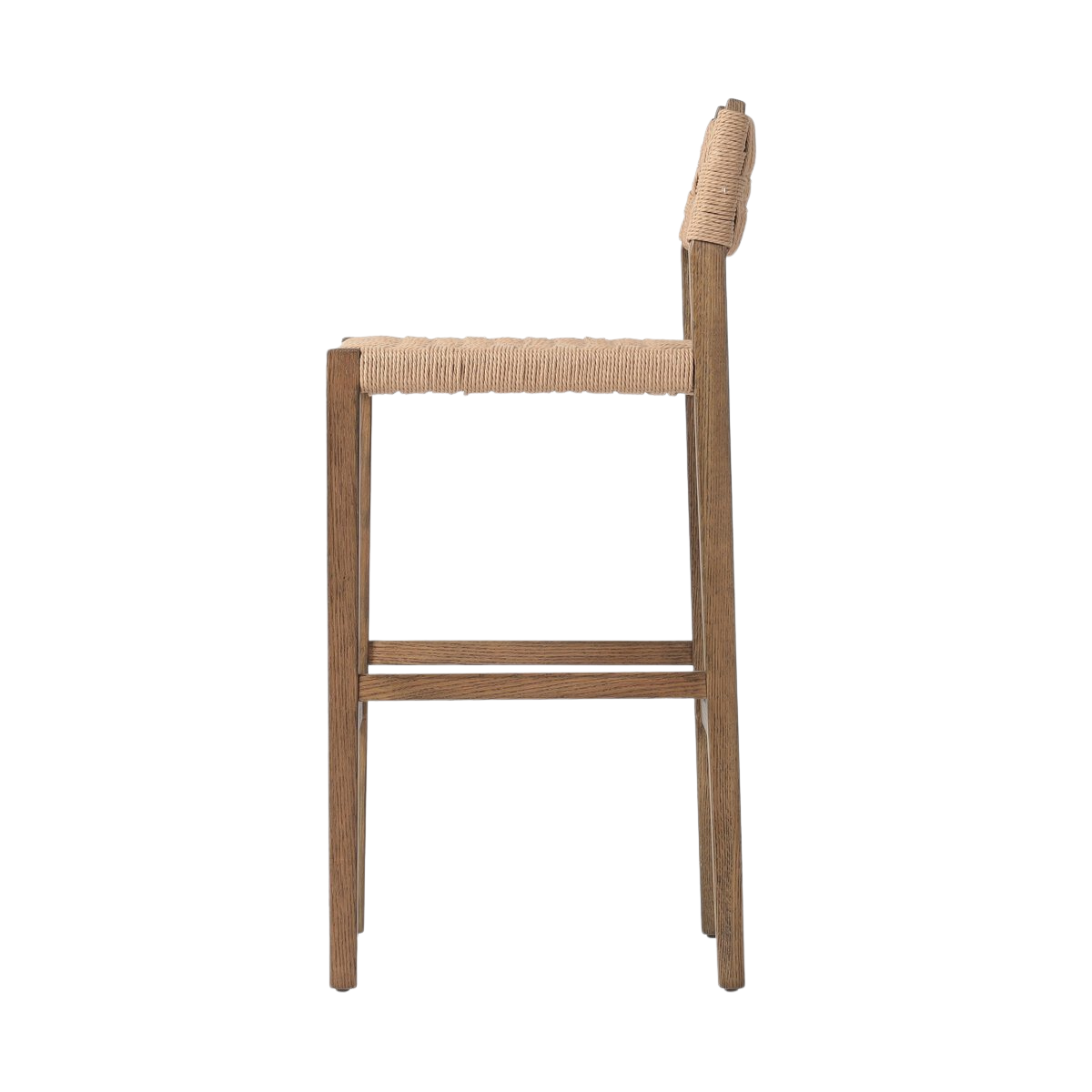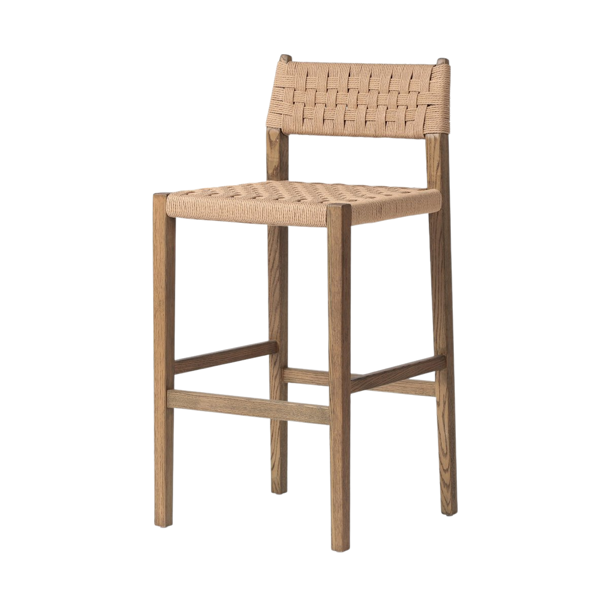 The Clara Bar + Counter Stool features a tapered oak frame paired with a woven double twisted paper cord back and seat, blending natural wood tones with subtle texture. Its clean lines and neutral palette offer a refined yet approachable aesthetic, making it an ideal choice for both bar and counter seating that balances durability with sophisticated design.