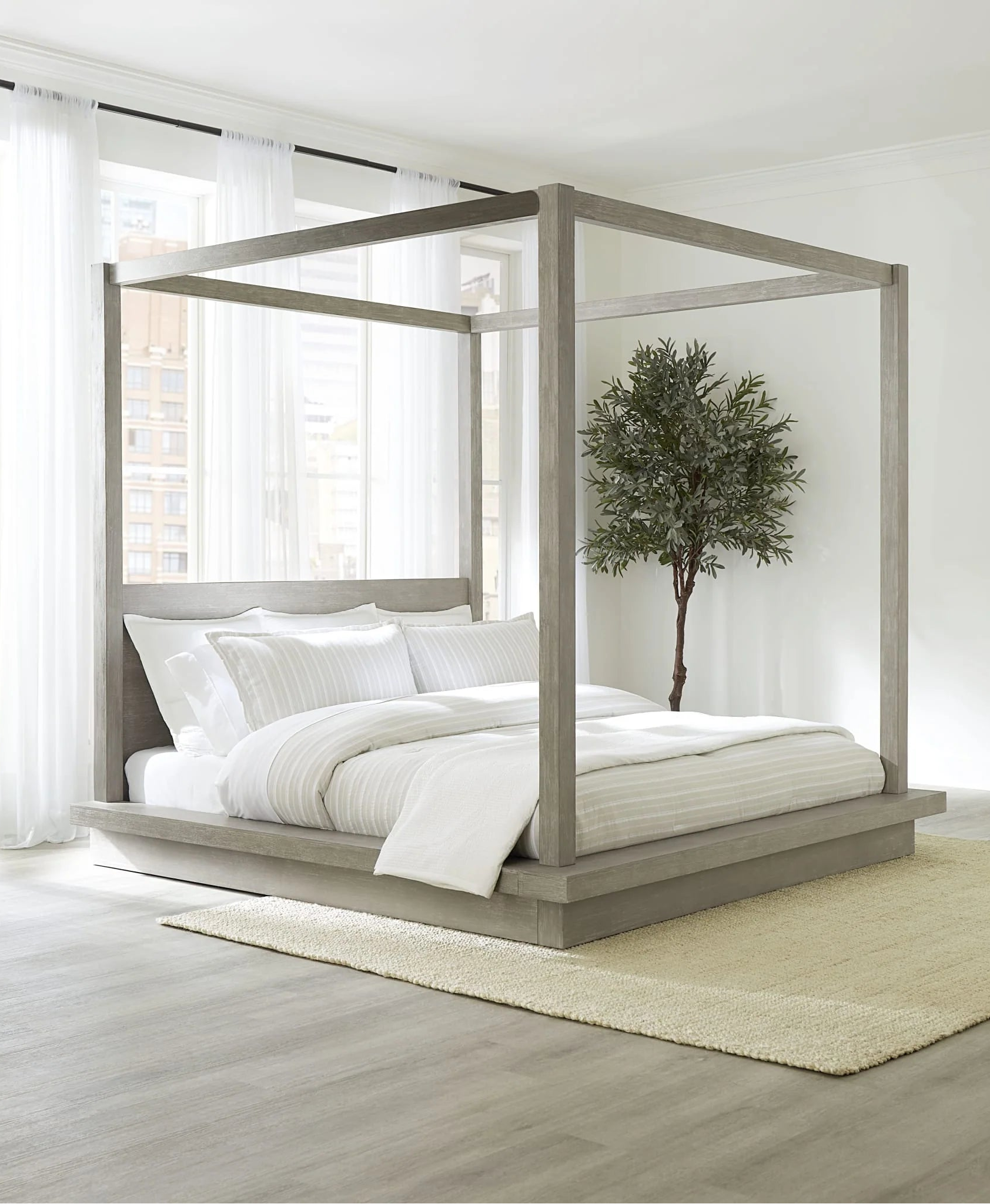 Decked out in an all new Mineral finish, the Melbourne bedroom offers a choice of true platform bed styles in a timeless modern silhouette. This generously scaled bedroom features crisp mitered edges, floating plinth style bases and a low-slung minimalist modern appeal. Acacia solid wood and Acacia wood veneer are lightly wire brushed, creating inviting, tactile surfaces that add warmth and comfort to the bedroom. Our proprietary Mineral finish is an opaque wood stain with a light white wash and low sheen lacquer designed to showcase the texture of the wood. The color is a light gray that shows cool or warm depending on lighting temperature.