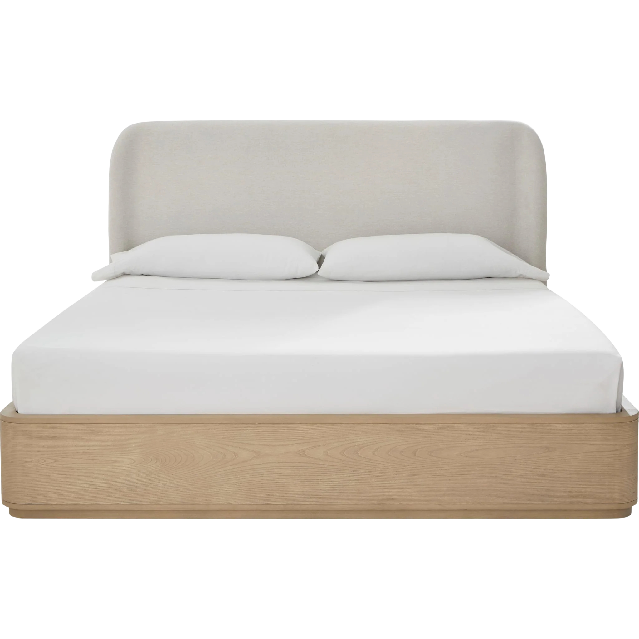 The Penny Upholstered Platform Bed's gentle curves and understated elegance embody the Quiet Luxury ethos, where every detail whispers sophistication. Crafted from mixed quartered and flat cut Ash wood veneer, its pale natural tones and subtle grain epitomize understated beauty. The luxurious curved linen headboard blend's seamlessly into the confident minimalist aesthetic.