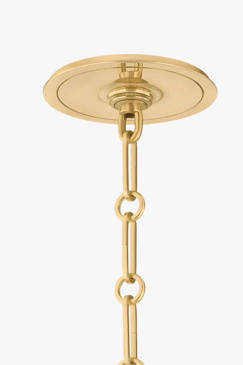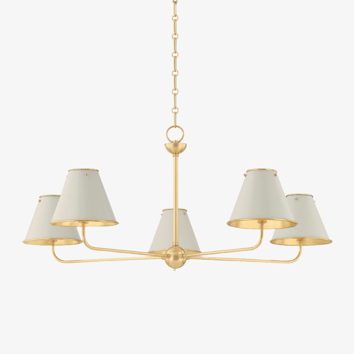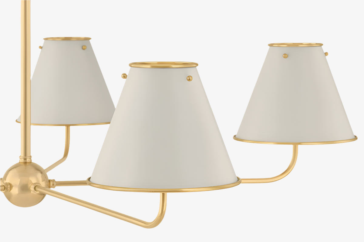 The Burghley Chandelier's tailored aesthetic and clean lines with sleek metal shades, makes heritage-inspired silhouettes feel fresh. In Aged Brass and Off White, the 5-light chandelier brings a sense of understated refinement to both traditional and modern interiors.