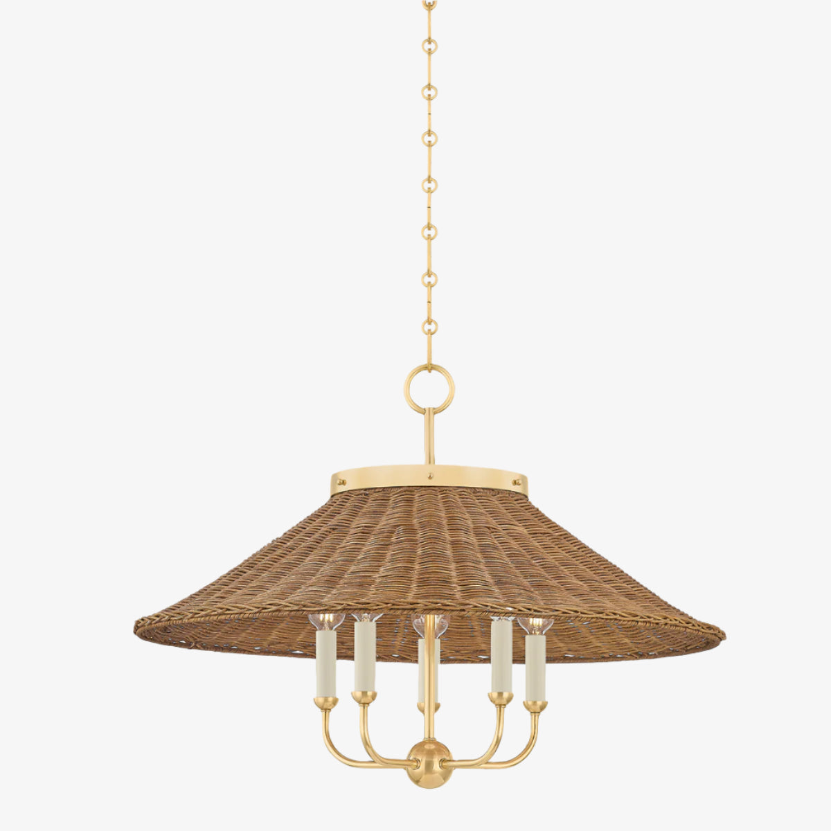 Kensington introduces the natural beauty of walnut wicker. The heritage feel of this chandelier stems from its artisanal craftsmanship, Aged Brass accents, and classic design details like a slender gooseneck arm make it an instant classic.