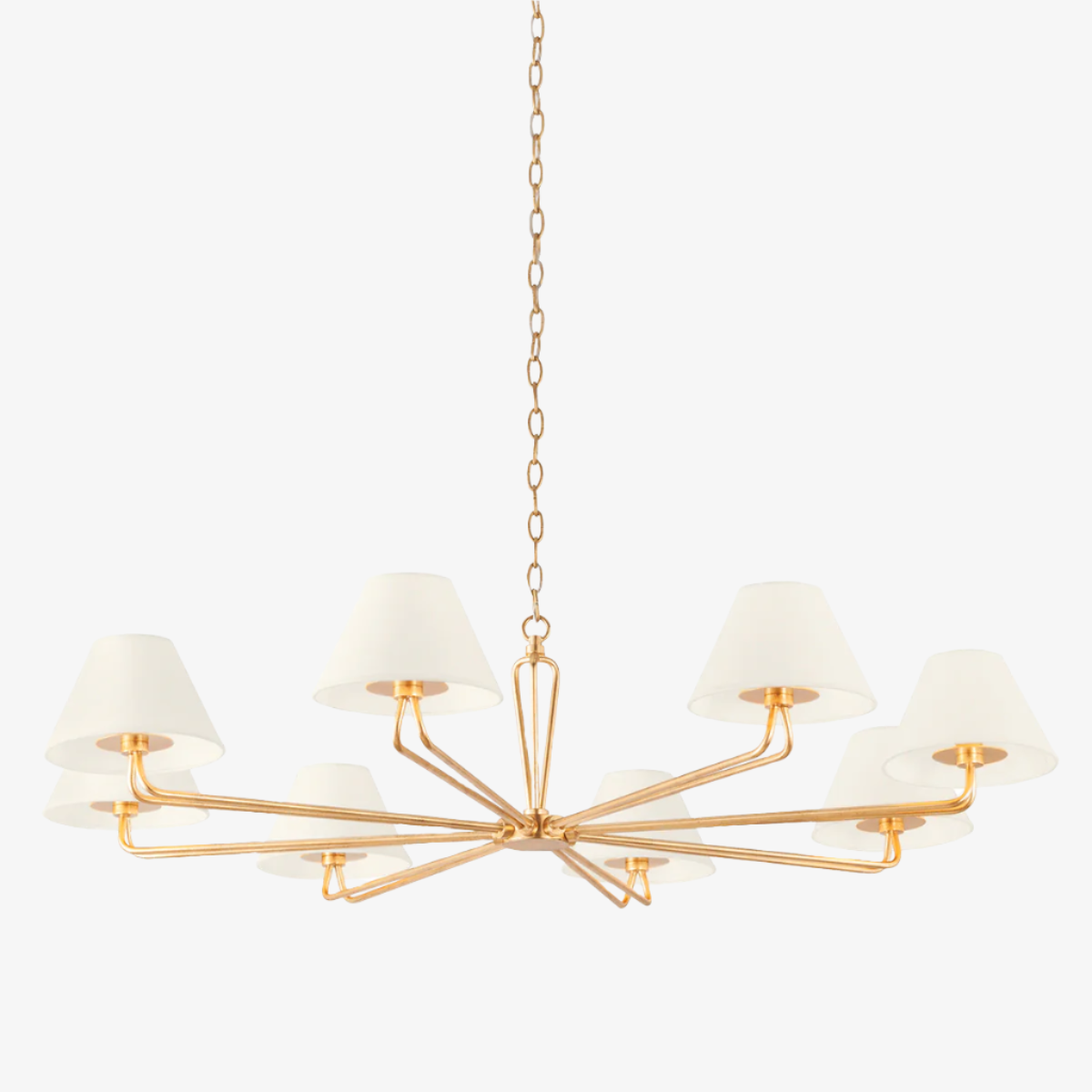 The Ozias Chandelier in Vintage Gold presents a masterful balance of streamlined design and stunning visual presence. Eight elegant lights are complemented by soft cream paper shades, producing a warm, ambient glow that enhances any interior space. The sophisticated vintage gold finish adds timeless luxury while maintaining the fixture's clean, architectural lines—perfect for discerning clients seeking both statement and substance in their lighting solutions.