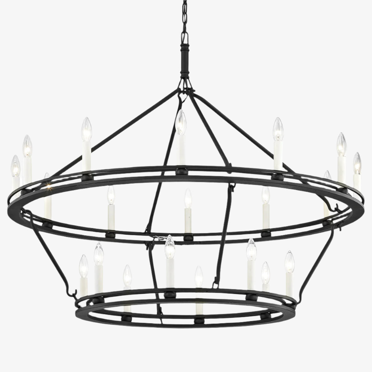 Elegantly designed with dual circular rings, the Sutton Chandelier creates a sophisticated focal point in any space. Twenty candlestick-style lights arranged around the perimeter deliver exceptional illumination while maintaining visual balance. The textured Black finish offers timeless versatility, complementing both traditional and contemporary interiors while adding dramatic contrast to lighter design elements.