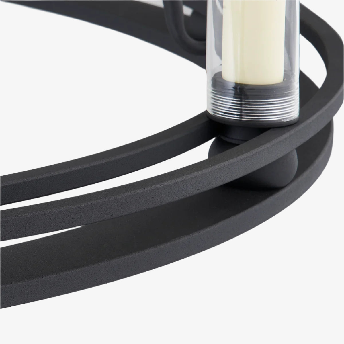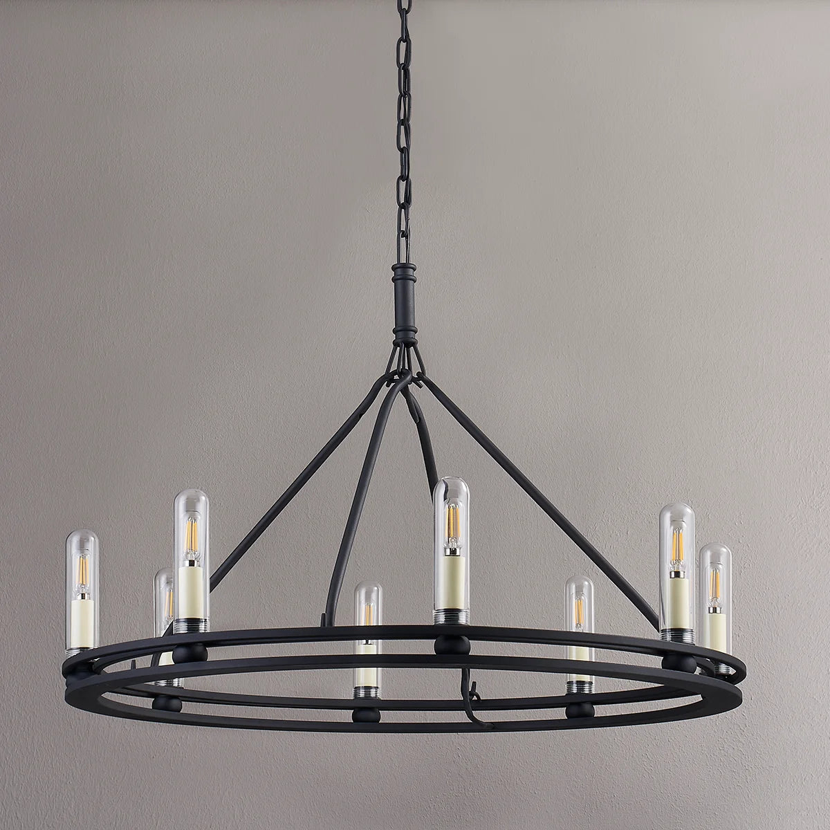 The Sutton Single Tier Chandelier features a refined circular silhouette formed by a singular ring design. Eight strategically placed candlestick fixtures deliver optimal illumination while maintaining elegant proportions. The textured black finish provides sophisticated contrast against any ceiling, creating a statement piece that balances contemporary styling with timeless appeal. Perfect for dining areas, entryways, or living spaces requiring focused, ambient lighting.