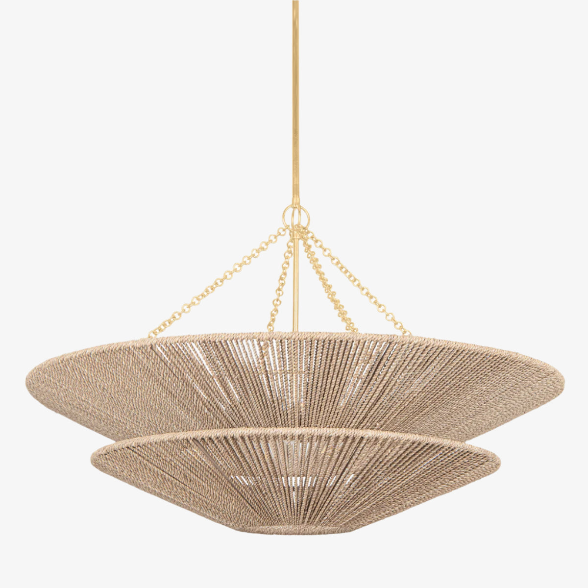 Two tiers of abaca rope give this chandelier a vibe that is both refined and organic. The open and airy design and soft Vintage Gold Leaf metalwork make the large scale feel lighter while still making a bold statement. Tropea is sure to bring a warm, natural feeling to any interior.