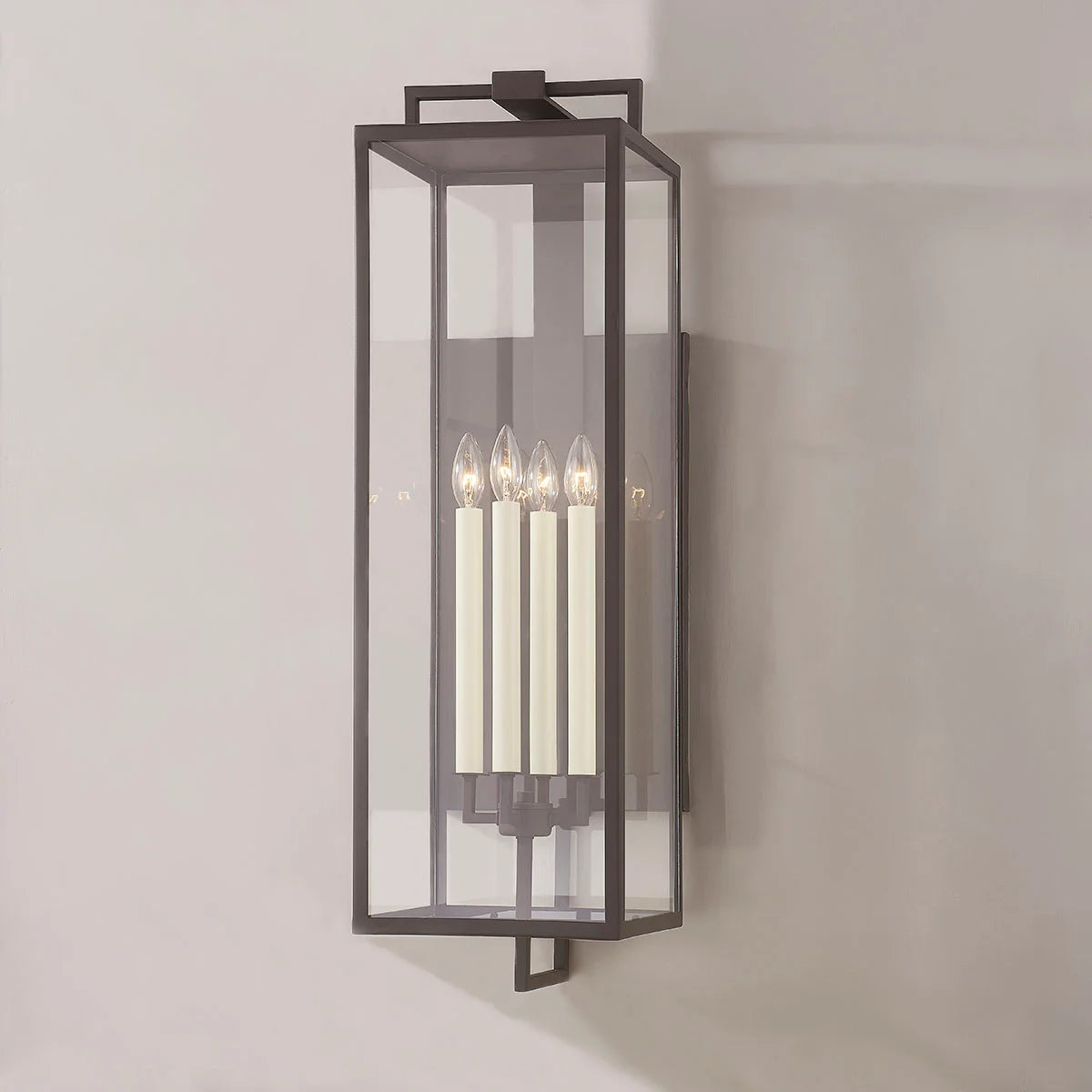 Designed for the exteriors of large-scale homes, the Beckham sconce takes the form of a classic box lantern with a modern, elongated silhouette. Within the frame, four cream candles emit ambient light in all directions. Textured Bronze finish, Beckham blends sleek geometry with old-world charm.