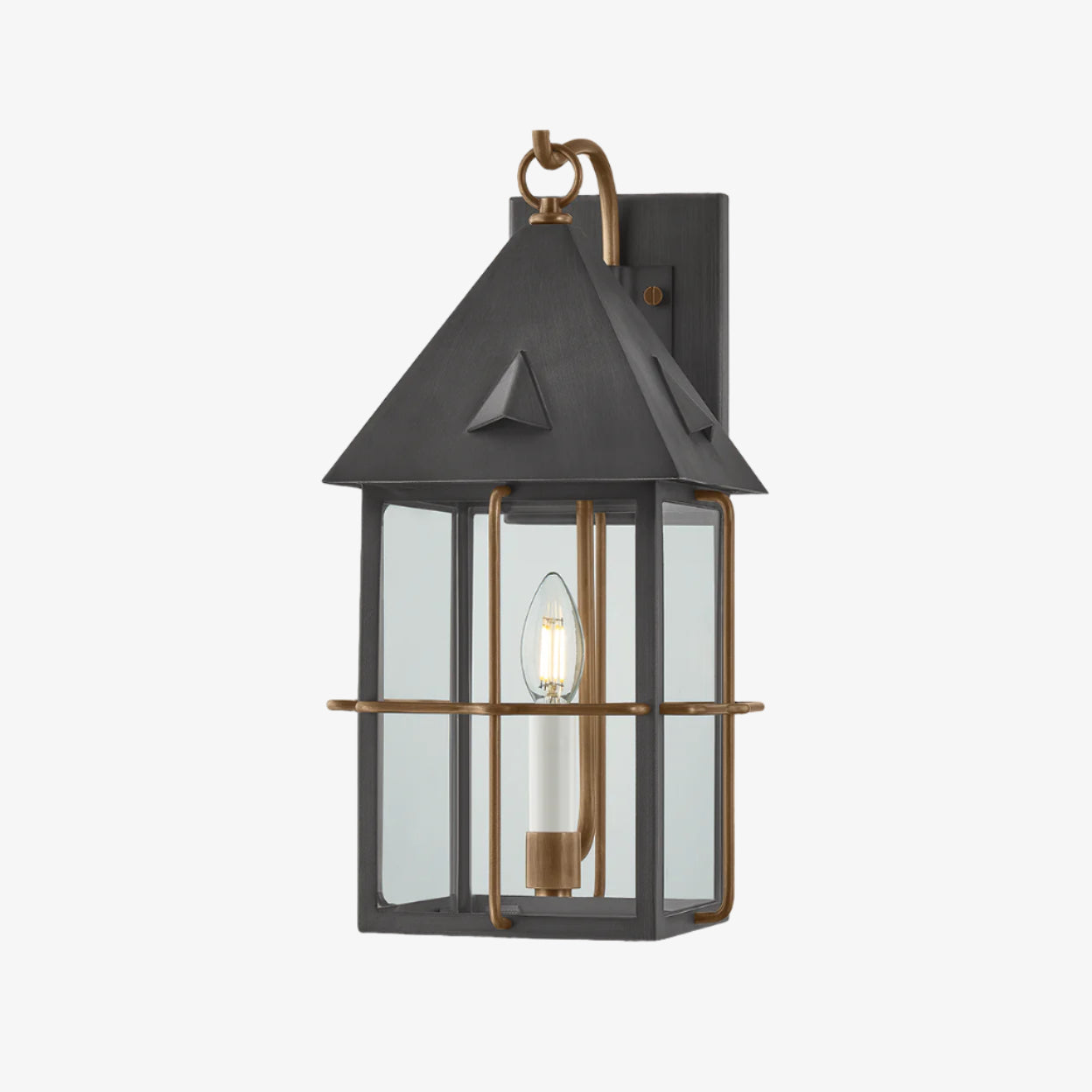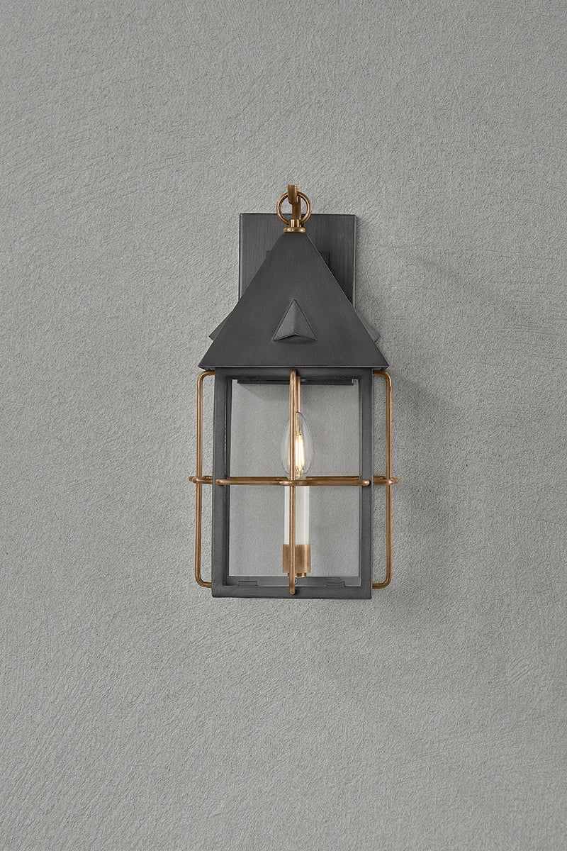 Inspired by a Cape Cod post lantern, this updated heritage sconce blends classic design features with contemporary mixed metal finishes. The Graphite frame is complemented by warm Patina Brass details, including the loop that suspends the fixture. A single cream candle lends a sense of nostalgia, welcoming you home on a dark night.
