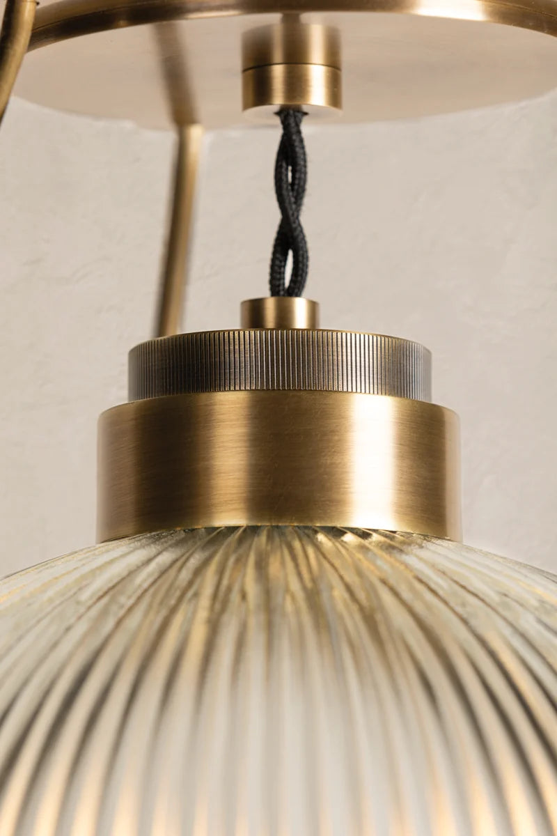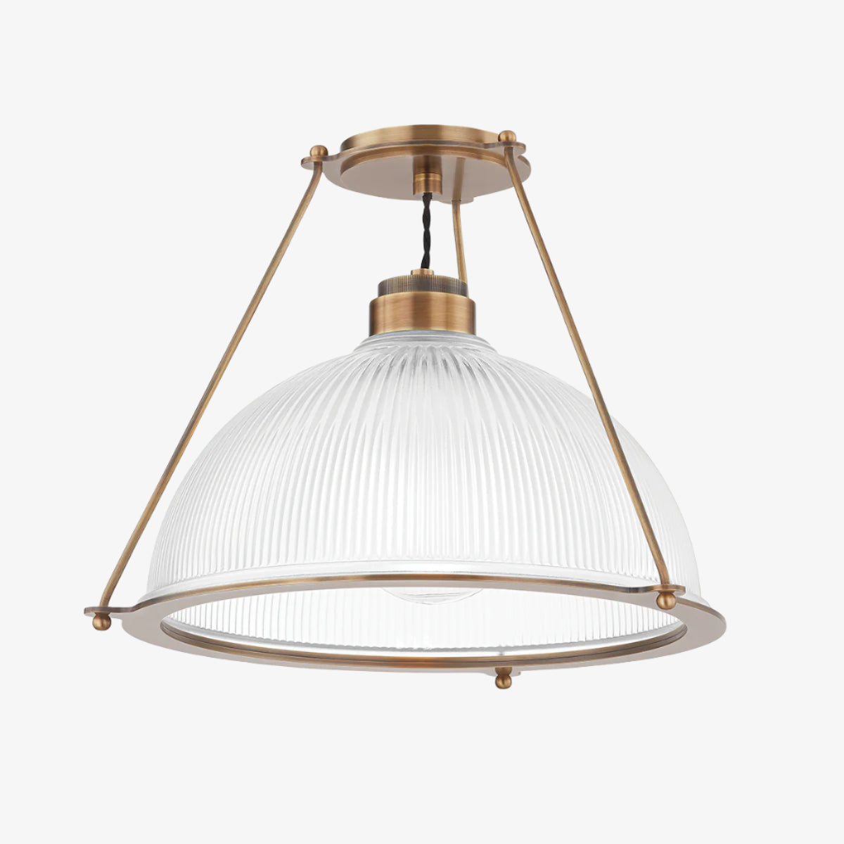 Industrial design with a modern edge, Glint features a dome shade of ribbed Holophane glass suspended from the ceiling within a unique Patina Brass framework. The twisted black fabric cord near the canopy adds a subtle vintage feel. This striking semi-flush mount makes a gorgeous statement close to the ceiling.