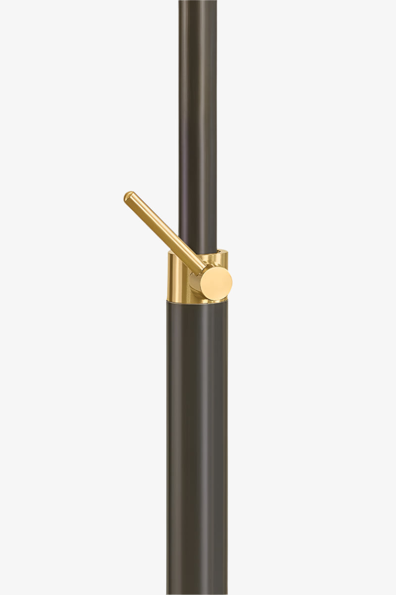Harriet deftly combines primary geometric shapes with mixed metals to create an adaptable modern floor lamp. The swooping turns of the lamp’s telescoping neck connect to conical forms on either end, contrasting sinuous lines with sharp angles. Small Aged Brass clutch swivels located at the middle of the neck and head allow you to customize the height and direction as needed.