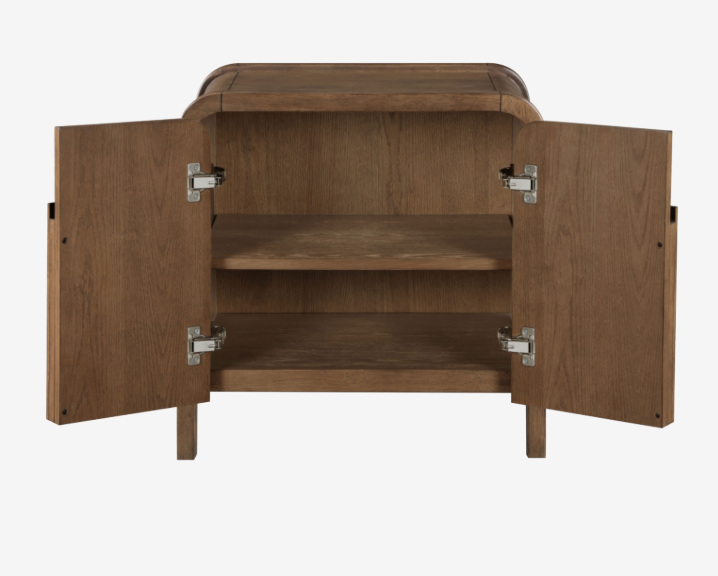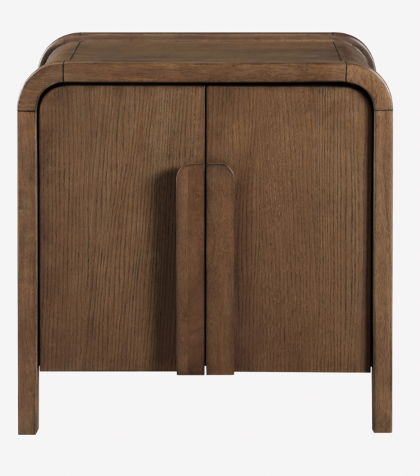 Rich brown oak veneer and solid wood give the Harmony nightstand its warm, mid-century appeal, while curved edges soften the silhouette. Vertical sculptural pulls add a bold, architectural touch that feels both classic and fresh. Whether storing items or styling your favorite decor, this piece brings refined versatility to any room.