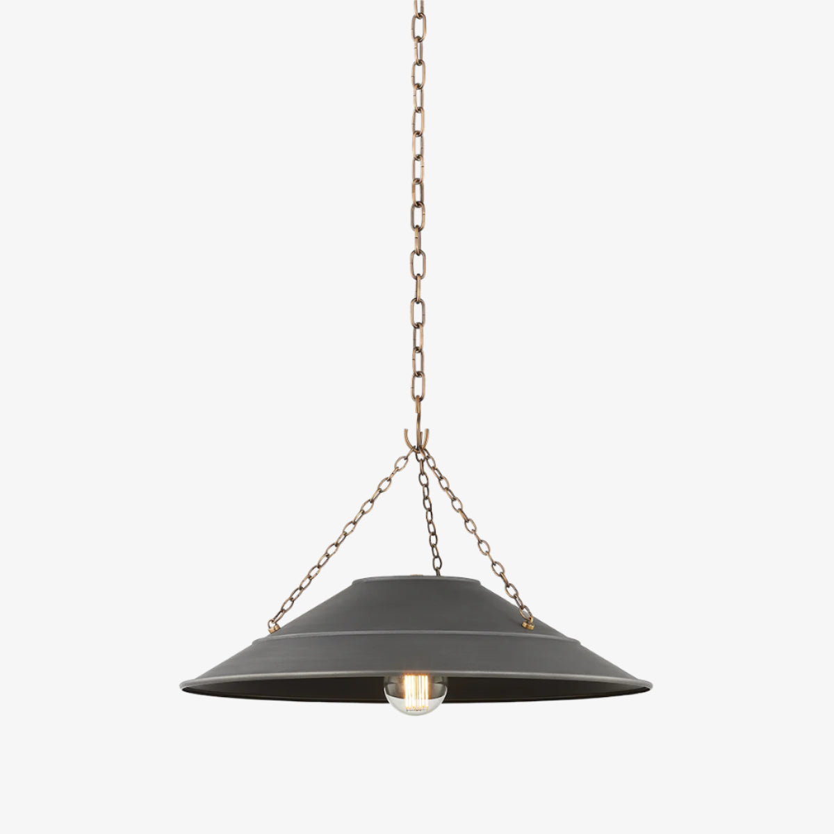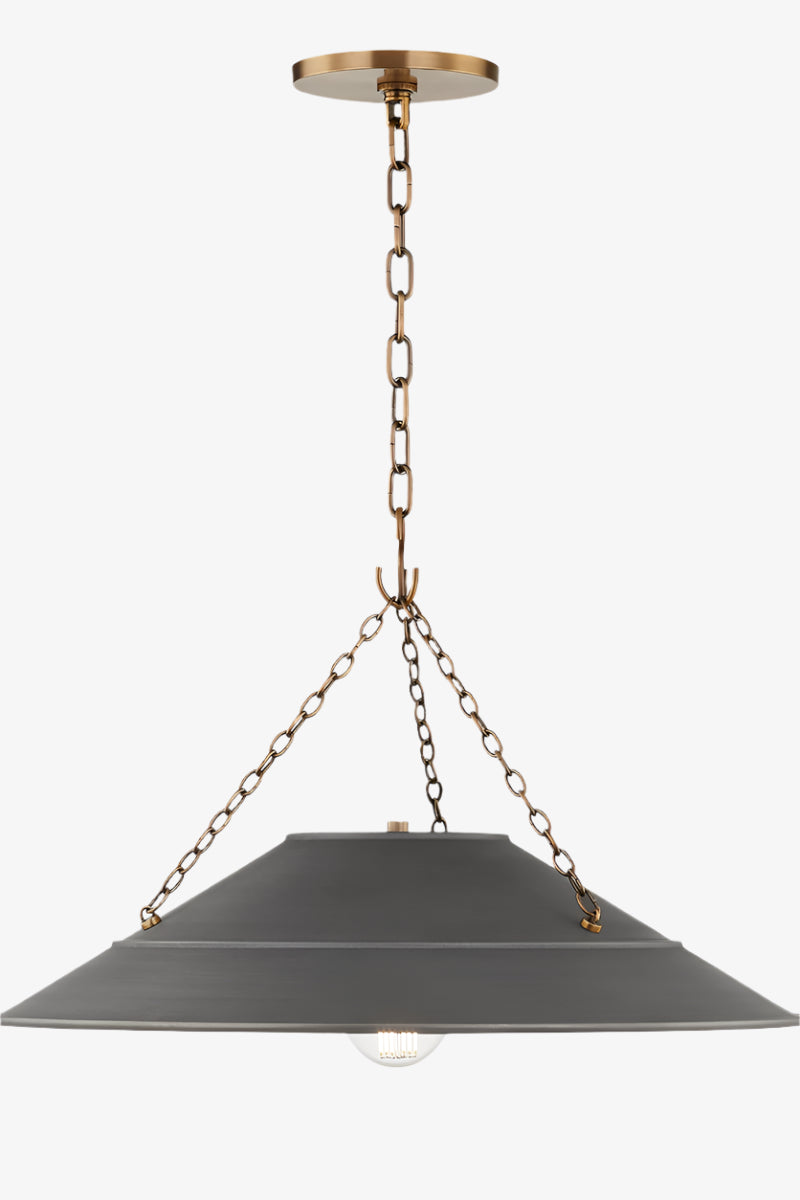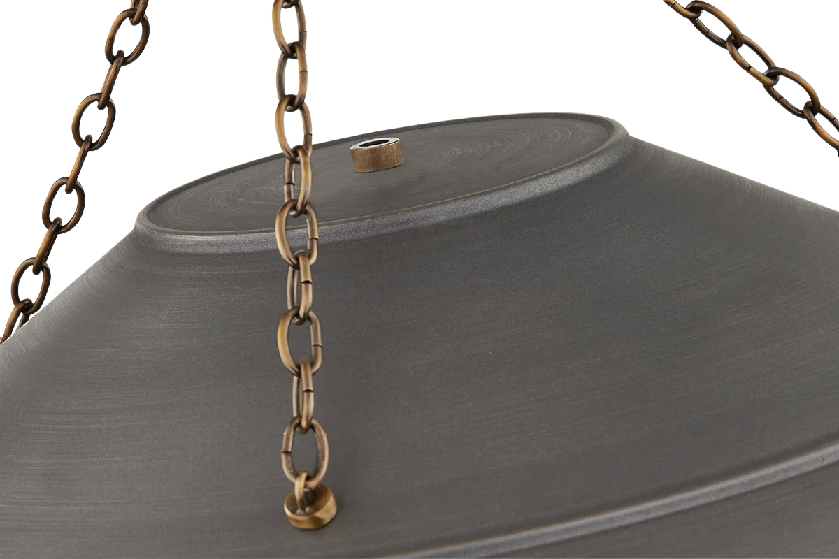With its exposed metalwork, chain detailing, and unique finish combination, Arcane has an elevated, industrial vibe. The graphite shade feels chic and gives off a warm glow. The Patina Brass hardware, chain, and canopy add a hint of shine that plays wonderfully off the graphite.