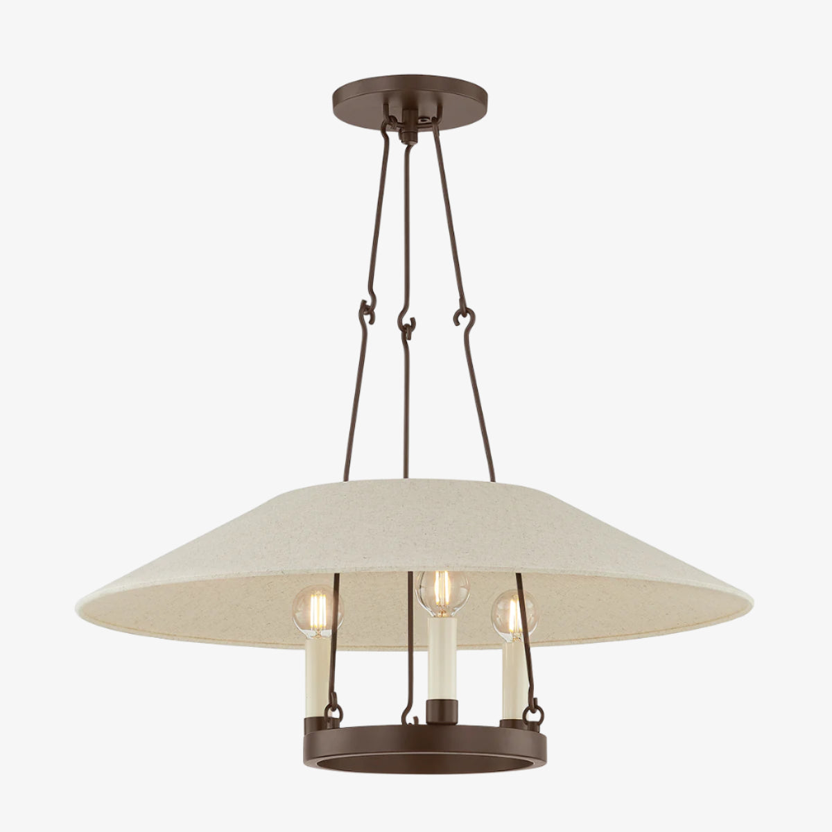 Archive reimagines the traditional ring chandelier. A trio of candles are displayed around a metal ring held aloft by delicate hooked arms. The natural linen shade over the framework is unexpected and adds an organic feel and a soft light. Make a sophisticated statement overhead with the Bronze finish.