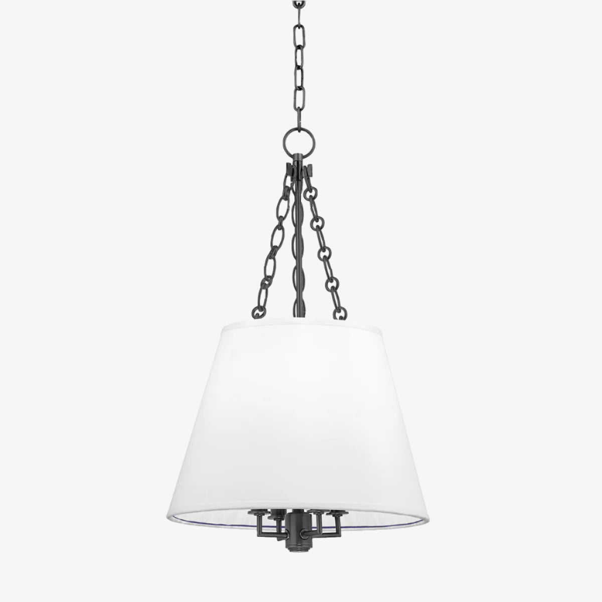 Clean-lined and smooth on the surface, closer inspection shows Burdett’s sumptuous side. Alluding to late nineteenth-century opulence, we adorn the interior of Burdett’s shade with richly gathered pleating. While the pendant’s subdued silhouette serves a contemporary sensibility, its lavish surprise rewards close appreciation.