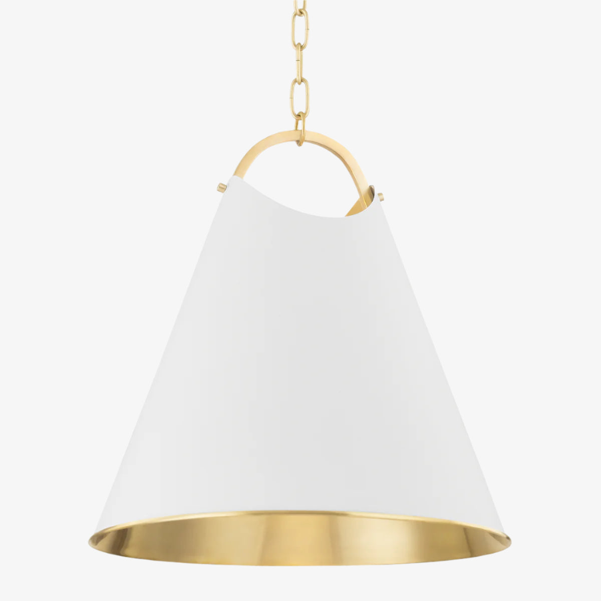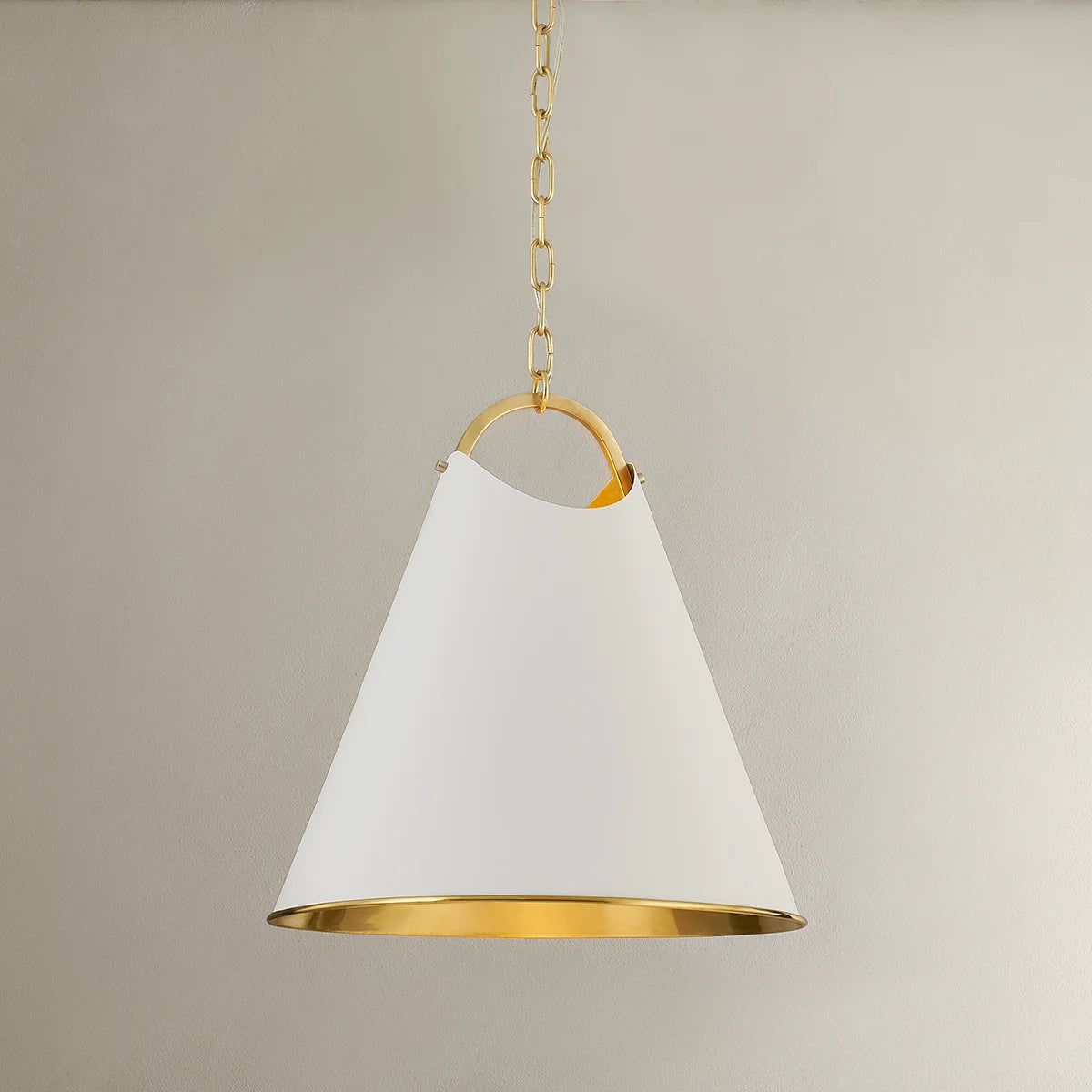 Burnbay's conical shade in Soft White is accented by a contrasting Aged Brass interior and rolled edge detail for an unexpected take on tradition. Paired with an Aged Brass arched strap and jewelry-like chain, these stylish pendants evoke a designer handbag quality that will add a fashionable element to a kitchen island.