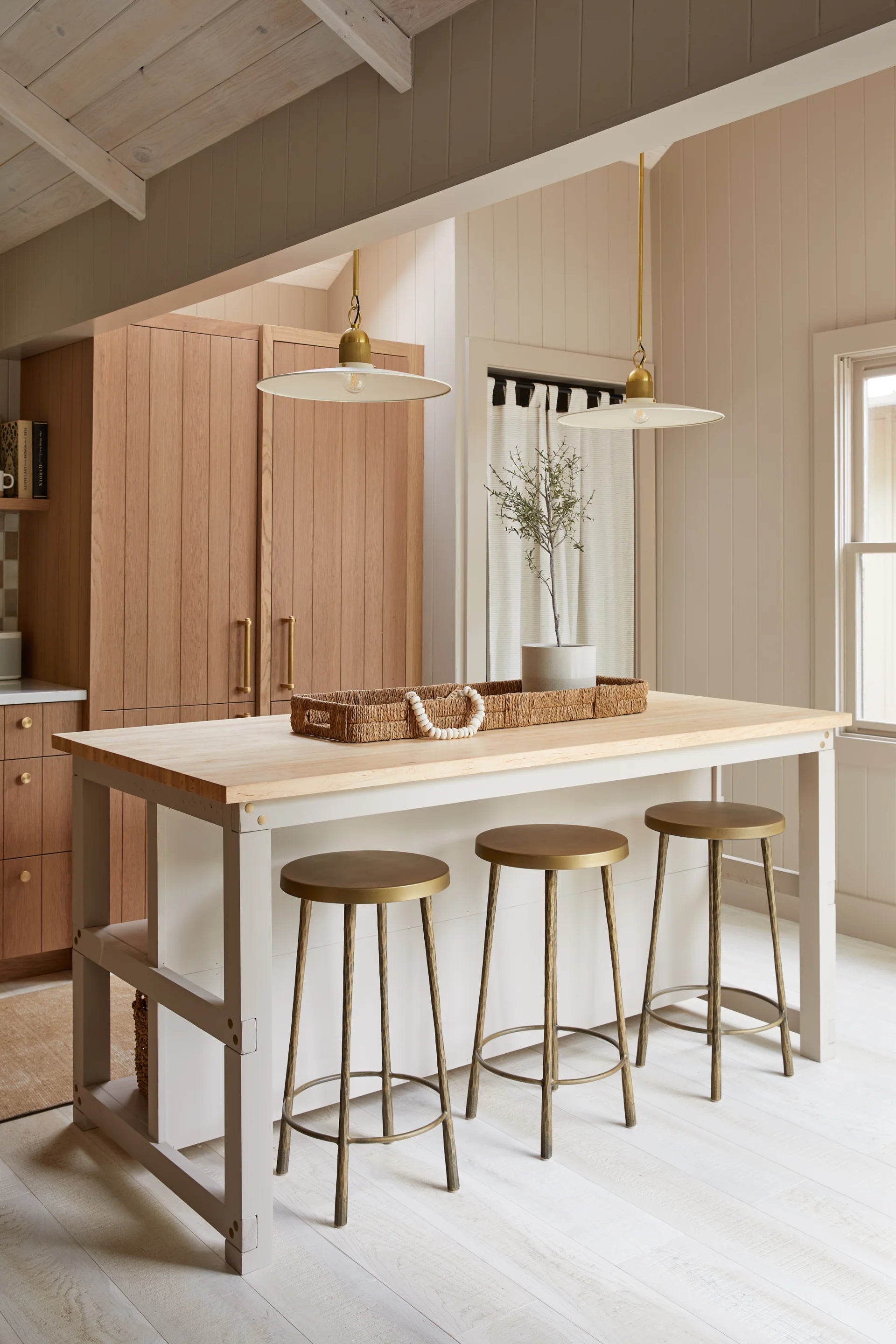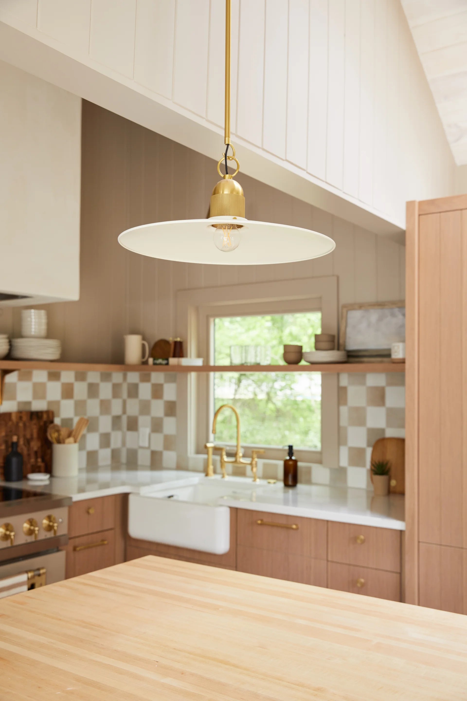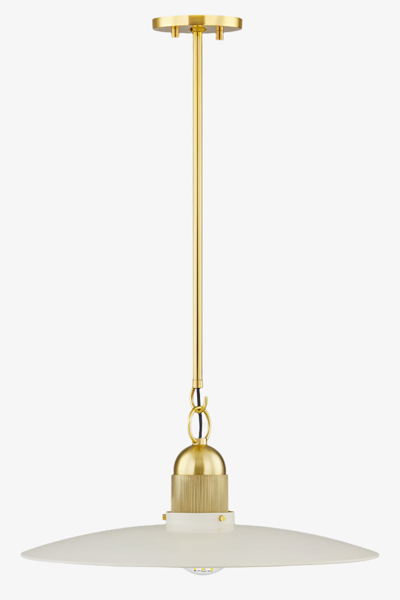 A beautifully modern take on the farmhouse pendant, Leanna features a very slim reflector shade in Soft Cream. Deliberate space between the shade and socket cup allows light to shine on the Aged Brass knurled detailing above as well as reflect off the shade itself. With its delicate hook and loop suspension, Leanna is stunning styled in multiples over the kitchen island.