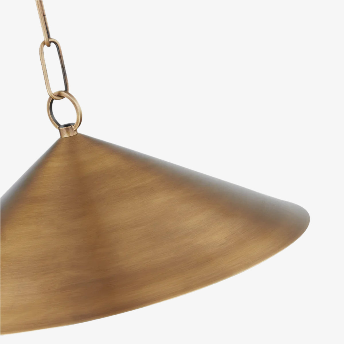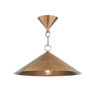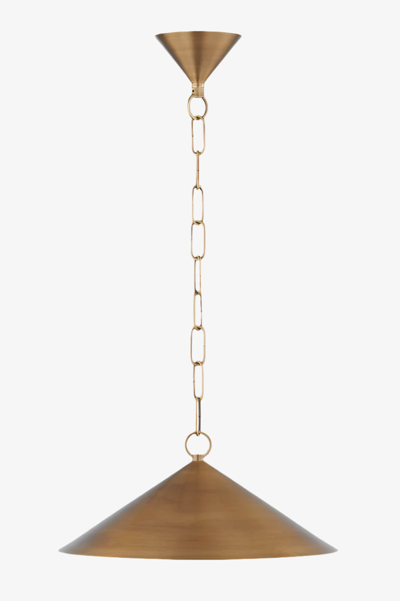 A straightforward conical shade is complemented by a similarly shaped canopy or backplate. The hard lines of the cones are broken up by graceful linked metalwork that draws the eye and makes the fixture feel unique. The pendant is lit from within by a single small bulb for a beautiful, soft lighting effect. The familiar silhouette and gorgeous warm tones of the Patina Brass make Midvale feel comfortable in just about any interior.
