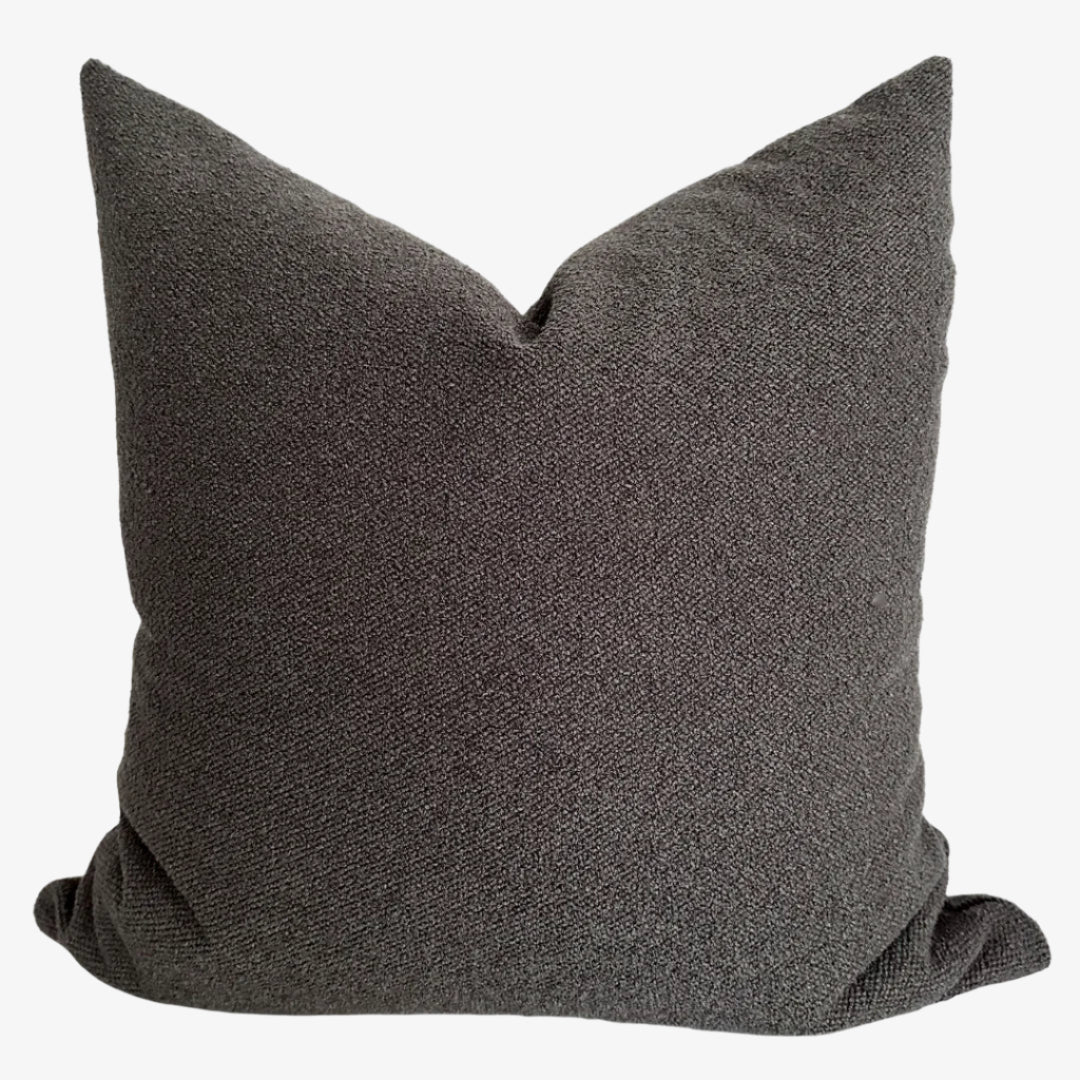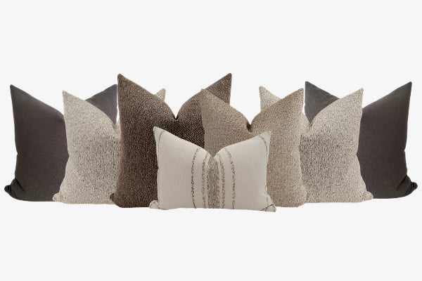 This exclusive collection showcases a rich mix of premium, high-end fabrics in an earthy palette of taupe, ivory, stone, and espresso. Each pillow cover is thoughtfully selected to harmonize together, creating a refined and inviting look that’s warm yet sophisticated.