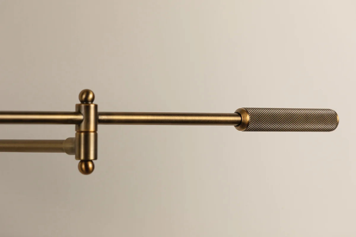 A dome-shaped Patina Brass shade at the end of a long, slender arm with exposed hardware give Cannon its retro industrial vibe. High-end details like the intricate knurling on the handle and socket add an air of sophistication. Both the arm and lamp angles are fully adjustable, making this slim-profile, plug-in sconce perfect for spaces that could benefit from customized lighting.