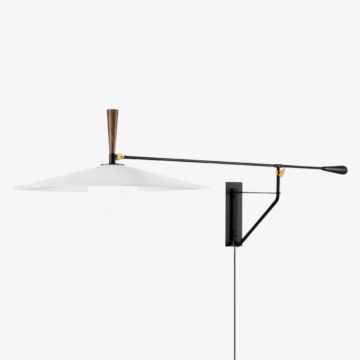 This portable extended wall sconce is a beautiful blend of function and style. A slender off-white linen shade topped with an Acacia Wood accent ""handle"" sits at the end of a long Soft Black arm. Perfect to extend over a chair in a reading nook, a desk in the office or over the table in a breakfast nook.